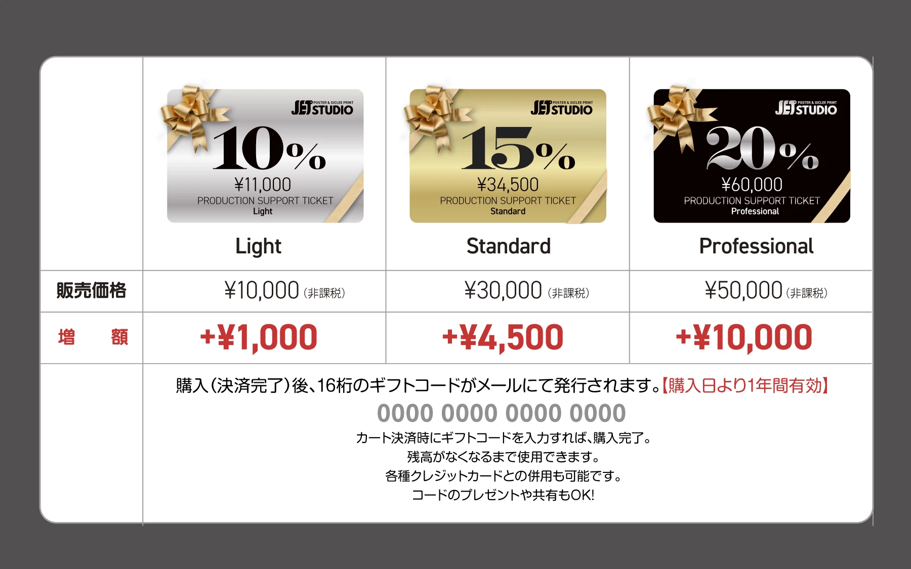 当事務所が運営するJET STUDIO 1周年及び、ジークレープリント開始を記念して、お得意様や卒制・展示会シーズンに向けた「制作支援チケット(ギフトカード)」を販売します。「予算で作品のクオリティを諦めてほしくない」という思いから、購入金額よりも最大20%多く使える特別な設定にしました。